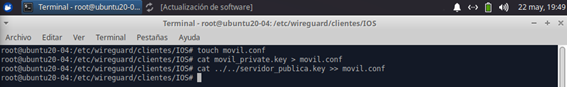 3 - Una vez hecho el paso anterior, vamos a crear un archivo movil.conf donde volcaremos la clave que acabamos de crear y cogeremos también la clave pública del archivo servidor_publica.key como podemos ver en la siguiente imagen:
