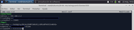 4 - En el siguiente paso, nos metemos a editar el archivo móvil.conf, donde agregaremos la clave pública del servidor, el puerto de escucha, además de, la ip pública(Endpoint), así como el puerto de destino: