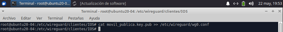 5 - Ahora, mandamos la clave pública del dispositivo al archivo de configuración del servidor de wireguard: