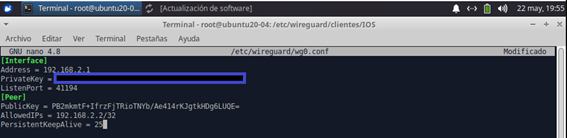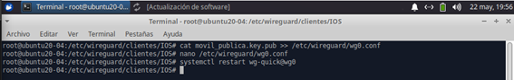 3 - Pasamos la clave pública al servidor de wireguard y reiniciamos el servicio