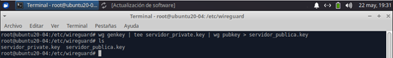 3 - A continuación, creamos el fichero wg0.conf y volcamos dentro el contenido de la clave privada que hemos creado para el servidor, para ello ejecutamos los siguientes comandos: