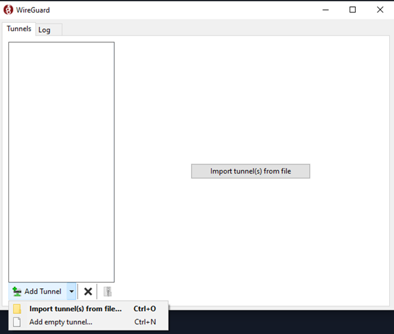 1 - Lo primero que debemos de hacer una vez instalado el cliente de wireguard para Windows, es crear un túnel, para ello le damos a la opción de abajo a la izquierda Add Tunnel y después a Add empty tunnel :