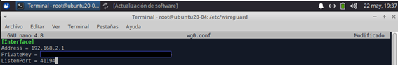 4 - Editamos el archivo wg0.conf(*) con nuestro editor preferido y empezamos a organizar de la siguiente forma: