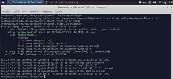5 - A continuación, habilitamos el servicio de wireguard con el siguiente comando: