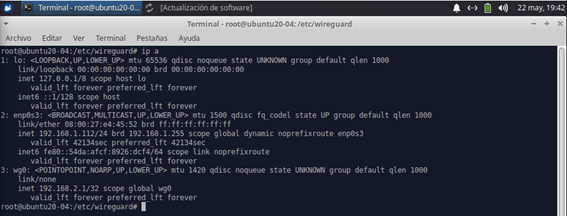 7 - Lo siguiente que vamos a mirar es que se ha creado una nueva interfaz llamada wg0, donde podremos ver como IP la que pusimos en el archivo de configuración que creamos: