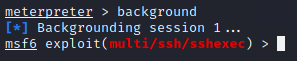 Una vez nos salga el meterpreter, lo mandamos a segundo plano, para poder seguir con la ejecución del siguiente exploit, para ello ejecutamos el siguiente comando: