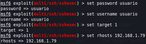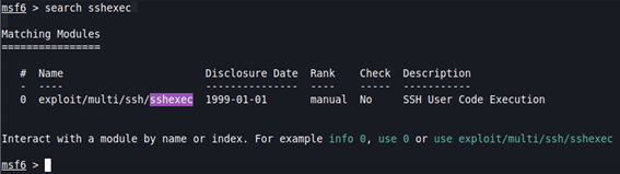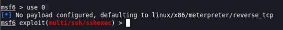 Para ello seleccionamos el exploit sshexec, que previamente hemos buscado con search: