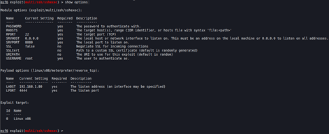 Una vez seleccionado el siguiente paso es configurar el exploit, seleccionando la sesión SSH que mandamos anteriormente a segundo plano y dejando el target en automático.