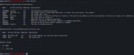 En este paso debemos de indicar el username , la password ** y el **RHOST (IP de la Ubuntu 18.04 a la que explotar), también debemos de cambiar el target, que para este caso será una Linux x64.